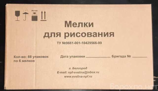 В каждой упаковке 6 мелков: зеленый, желтый, розовый, голубой и два белых. Стоимость одной упаковки - 28 рублей. Транспортный короб содержит 88 упаковок по 6 мелков, цена короба - 2464 рубля.